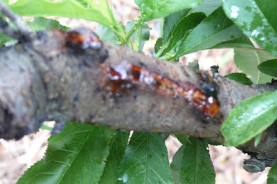 Gummosis is the name given to the oozing of sap from wounds on fruit trees. Gummosis robs a tree of nutrients. The sap hardens into gummy yellow to orange blobs on the bark. Gummosis can be the result of damage done to the trunk of the tree by you (with a mower or other garden tool), or environmental stress (lack of water or nutrients), or a fungus named Cytospora (that came in via a wound). The Cytospora fungus kills the wood underneath the wound, often causing whole branches to die. Infected wood and defoliation that may occur weakens the tree. If the disease infects the trunk, the whole tree may die.